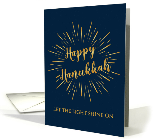 Hanukkah greeting card in gold light burst and gold HAPPY HANUKKAH calligraphy.