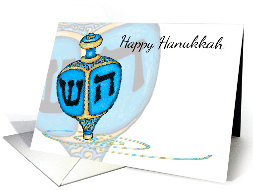 Hanukkah Greeting Card With Dreidel the Dreidel has a Mosaic pattern with a large ghost Dreidel in the background