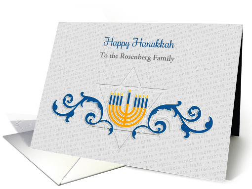 | Artist Notes: | Personalize this Hanukkah greeting with the name of your recipient. The gray background has a text pattern with the words "miracle of lights". The festive design features a menorah with decorative blue flourishes. There is a Star of David that appears to be imprinted. Please note this is only an effect, and the card does not have texture. Graphics by Doodles First. |