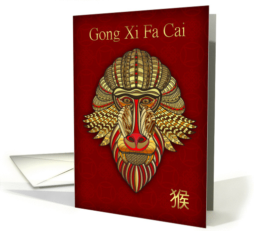 Year of the monkey Chinese Zodiac Greeting card, with striking monkey mask in gold and red effect also looks like it stands out, the symbols above say Gong Hei Fat Choi - Happy New Year, the bottom symbol is for the Monkey, a stylish but timeless new year card with a bit of boldness to it
