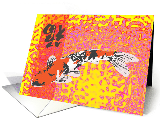 Artist Notes: | Sketch of a lovely koi fish in orange, white and black markings, swimming in a shimmering watery background in yellow, red and pink. A stylized brush form of the Chinese character for luck is displayed upside down to symbolize luck coming in. Fish, in Chinese mythology, symbolizes abundance. |