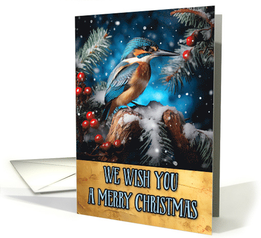 A colorful kingfisher bird in a snowy landscape with christmas trees on a gold-colored background wants to wish you a merry christmas. A heart-warming card to send to your friends and loved ones this holiday season.