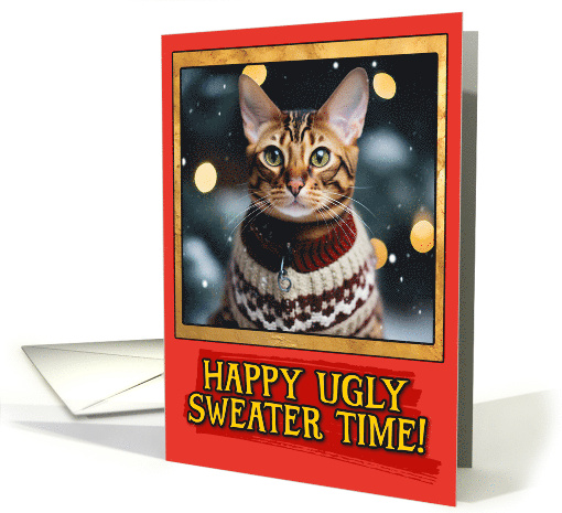 A bengal cat dressed in a christmas sweater amidst christmas trees with lights in the snow and the text "Happy ugly sweater time!" in a yellow font on a red background with gold colored border. A fun Christmas design to send to your friends and loved ones.