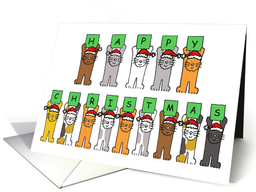 Two rows of cats wearing Santa hats which hang at jaunty angles. The cats are holding up lime green cards which have letters on that spell out 'Happy Christmas'. Inside, the card says 'From the cat'.