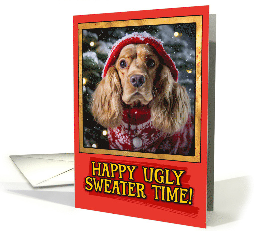 An american cocker spaniel dressed in a christmas sweater amidst christmas trees with lights in the snow and the text "Happy ugly sweater time!" in a yellow font on a red background with gold colored border. A fun Christmas design to send to your friends and loved ones, an american cocker spaniel mom or dad, a breeder or a dog shelter.