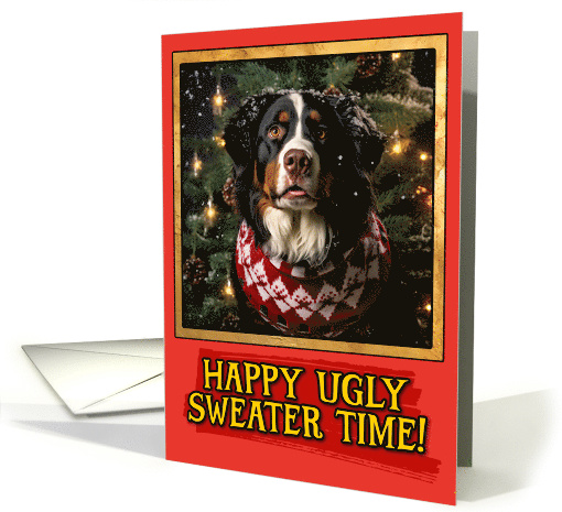 A bernese mountain dog dressed in a christmas sweater amidst christmas trees with lights in the snow and the text "Happy ugly sweater time!" in a yellow font on a red background with gold colored border. A fun Christmas design to send to your friends and loved ones, a bernese mountain dog mom or dad, a breeder or a dog shelter.