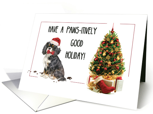 A muddy pawed Cavalier King Charles Spaniel is sitting beside a colorful Christmas tree on the cover of this card. A card like this one will be a perfect gift for any dog lover come Christmas time.