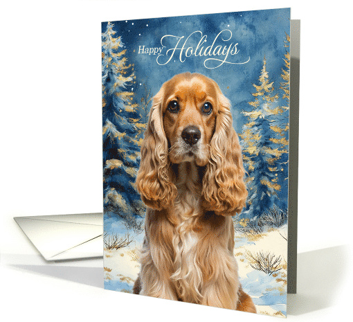 This seasonal greeting has a Happy Holidays message and a sweet Cocker Spaniel dog sitting against a lovely winter white, blue and golden hue winter forest.
