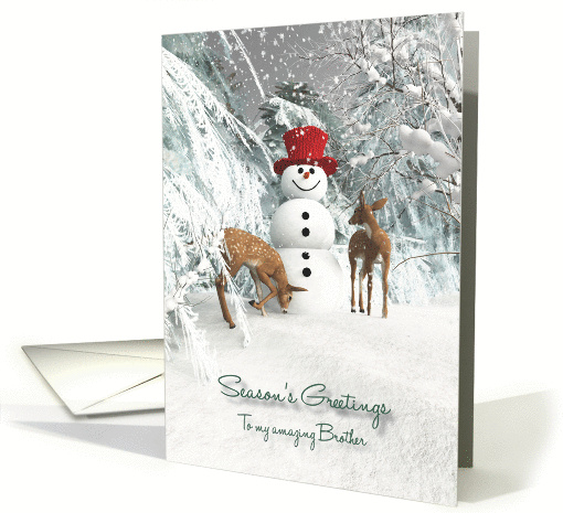 A whimsical fantasy Season's Greetings card for your Brother. Two adorable fawns just discovered a smiling snowman with a red hat in the woods. Inside there is a text which you can customize to something very personal.