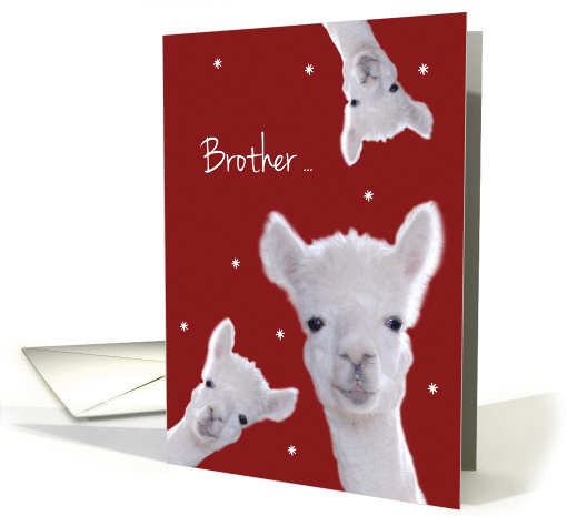 Wish your brother a warm and fuzzy Christmas with this humorous holiday card that features three fuzzy, white llamas peeking in from all different angles and directions with tiny white snowflakes on a bold red background with a playful, fun typeface.