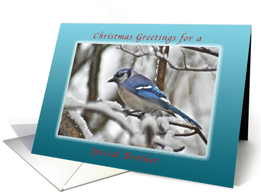 A beautiful bluejay on a snow covered branch forms the backdrop for the message Merry Christmas.