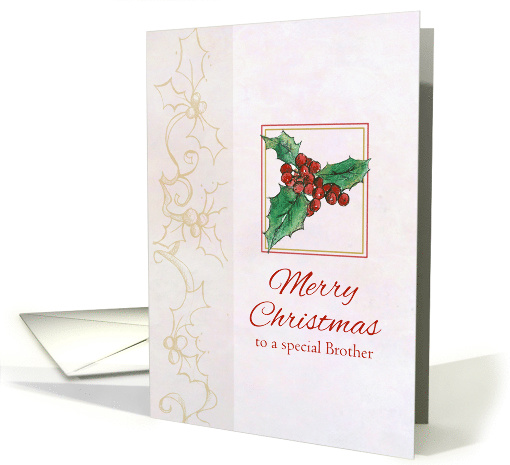 Merry Christmas to a special brother greeting card featuring a botanical drawing of holly leaves and berries in pen and ink with watercolor with holly sketches in the border on an off white background.