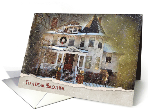 Christmas for Brother, old Victorian house with torn edge border