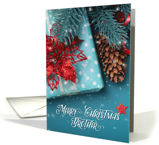 Lovely red and blue seasonal hues are featured on this card to wish your brother Christmas cheer with a bits of falling snow and a wrapped gift under the tree.