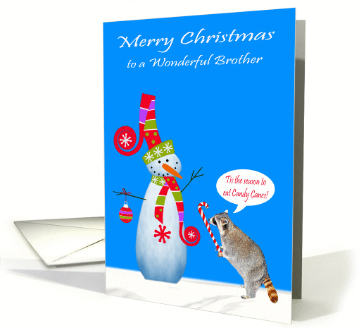 Christmas to Brother, Raccoon eating a candy cane with snowman