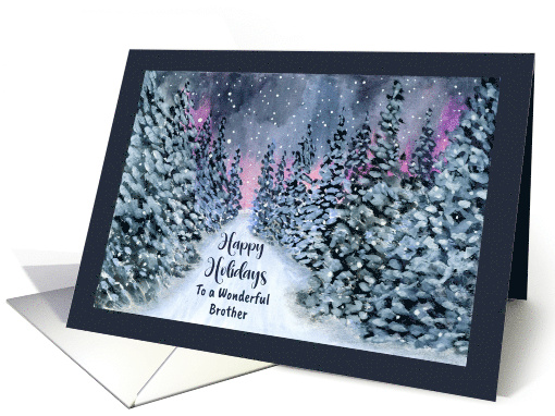 Give your amazing Brother this lovely Christmas card and send him best wishes for the holiday season. This illustration depicts a painting of a wintry scene, complete with a vivid sunset sky and an evergreen forest covered in snow.