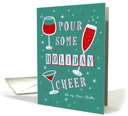 This festive greeting card features retro-style typography with red holiday drinks and the cheerful pun “Pour Some Holiday Cheer.” Set against a teal background with playful stars and sparkles, it's the perfect card to celebrate the season in style. Whether you're toasting with wine, bubbles, or a holiday cocktail, this card brings the party spirit to any loved one. For brother