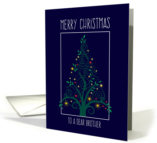 Pretty holiday card with eye catching graphic illustration of a Christmas tree made of swirls, stars, leaves and ornaments in red, green and yellow on a midnight blue background. A perfectly simple and elegant holiday greeting for your brother.