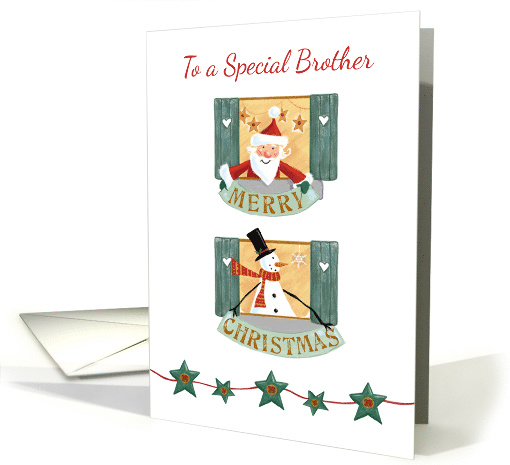 Simple white festive design with traditional Santa and Snowman at window with Merry Christmas banners. Distressed Hand stamped style lettering of "Merry Christmas" Red text at top reads "To a Special Brother" ©DaleSimpson