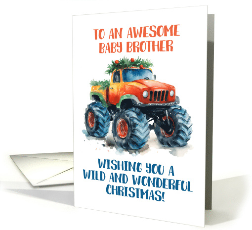 Cover text in modern typography at the top reads: "To an awesome baby brother" and below reads: "Wishing you a wild and wonderful Christmas!" In the middle is a whimsical watercolor illustration of a chunky monster truck in orange, red, green and blue, decorated with Christmas tree branches, greenery and baubles, on a clean white background. Inside verse reads: "Wishing you a Christmas filled with joy and adventure, and a truckload of gifts!" Perfect for a special little brother at Christmas time.