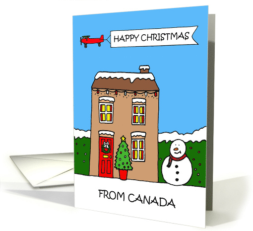 | Artist Notes: | A cartoon of a small house decorated with snow, a snowman, fairy lights and a festive tree. A plane is flying over the house with a banner behind it that says 'Happy Christmas'. The words 'From Canada' accompany the image. |