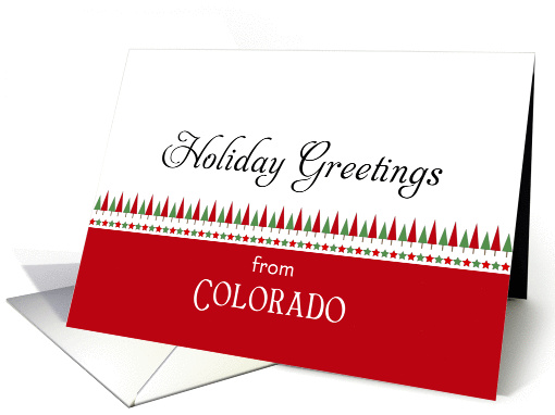 | Artist Notes: | Christmas card from Colorado with illustration of a row of red and green Christmas trees and stars. Inner verse is customizable. This design is available with a customizable front in my store where you can change the state to any family name or other state ... Sheryl Kasper Card Store. |