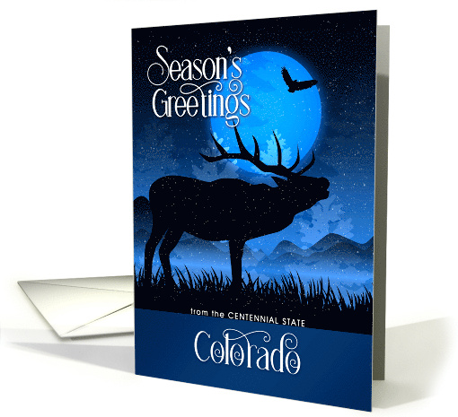 | Artist Notes: | Beautiful midnight blue hues create a gorgeous winter woodland scene with a moose silhouette create a lovely choice for anyone from Colorado to send their wishes for a peaceful season. |