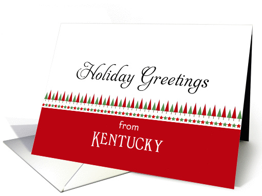 | Artist Notes: | Christmas card from Kentucky with illustration of a row of red and green Christmas trees and stars. Inner verse is customizable. This design is available with a customizable front in my store where you can change the state to any family name or other state ... Sheryl Kasper Card Store. |