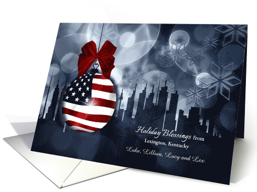 | Artist Notes: | Blessings from Kentucky this holiday season with a stars and stripes theme and lovely snowflake skyline in deep blue, nearly navy hues. The front custom text may represent anywhere you simply enter your town and state. |