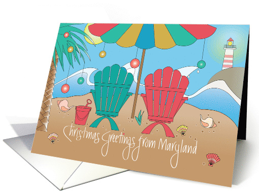 Wish all of your friends and family a Happy Holiday this year, if you are a resident of Maryland or a frequent visitor to Maryland, with this envious beach scene. A duo of holiday-colored beach chairs fill the beach with Christmas colors, above the hand lettered wording "Christmas Greetings from Maryland". Seashells decorated the sand, all around the wording, and beneath the ornament decorated umbrella and palm tree. Across the flowing sea waves, a lighthouse stands guard on top of a far off cliff. The card's inside wording says "Wishing you a joyous holiday!"