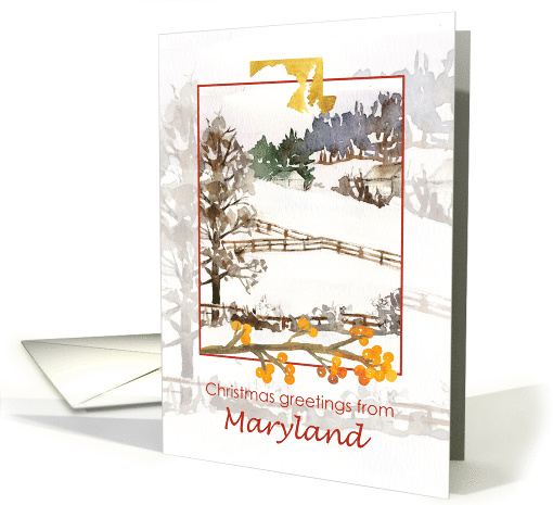 | Artist Notes: | Merry Christmas greetings from Maryland featuring a farm with barns, fences, trees, and rolling farmland covered in snow accented with golden winter berries and the state shape painted with watercolor. |
