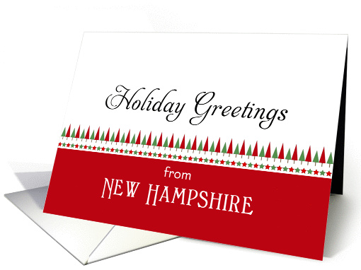 | Artist Notes: | Christmas card from New Hampshire with illustration of a row of red and green Christmas trees and stars. Inner verse is customizable. This design is available with a customizable front in my store where you can change the state to any family name or other state ... Sheryl Kasper Card Store. |