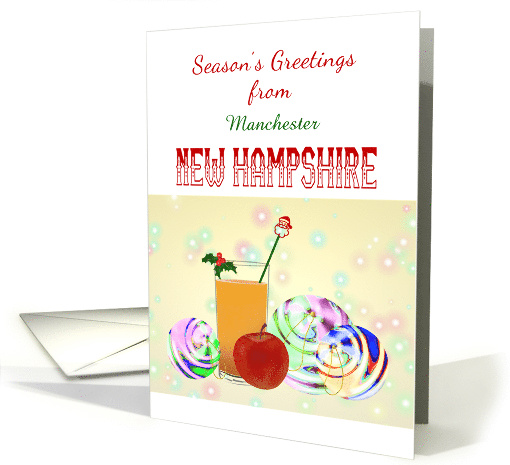 | Artist Notes: | Customizable season's greetings from New Hampshire, in this case, Manchester. This fun design features a glass of apple cider, an apple and colorful baubles. A green stirrer has an icon of Santa. A small sprig of holly berries sits on the rim of the glass. In the background we have a soft beige banner with spots of colorful lights. Apple cider is the official beverage for New Hampshire. |
