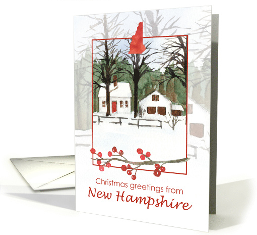 | Artist Notes: | Christmas greetings from New Hampshire featuring a cottage house and garage tucked in the evergreen trees with layers of snow for the holiday season accented with a branch of red berries and the state shape hand painted with watercolor. |