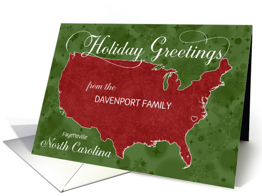 | Artist Notes: | Add your family name and city to this red & green "Holiday Greetings" card. The front features a US map showing a heart over the great state of North Carolina.Designed by Simply Put by Robin. |