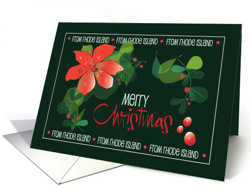 "Merry Christmas" is the creative white and red hand lettered wording that highlights this uniquely beautiful holiday card for those of you who call Rhode Island home or visit there regularly. The words are reinforced by two opposing crests of multi-colored green boughs of Christmas berries. They reflect each other diagonally in half crest shapes and are dotted with vivid red berries, matching the bright red in the large and lovely poinsettia set above them. Encircling the card is a phrase with your state name, "From Rhode Island", repeating itself over and under the wording, on the deep Hunter green background, in small white lettering, across the entire width of the card, creating a letter-filled second border, within the fine white line around the card. The inside wording of the card says "Wishing you all the joys of the season from Rhode Island and hoping the New Year brings you happiness and joy."