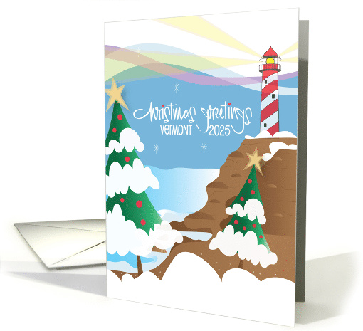 This is the perfect holiday card for those of you who love life in Vermont and want to share the beauty of your state with everyone at Christmas. The card's colorful card exhibits a candy cane striped lighthouse atop a rocky cliff, on the card's right side, with two snow and ornament decorated trees, in the lower parts of the card. Hand lettered wording, in white, says "Christmas Greetings - Vermont 2025", below the light that is radiating out from the light in the lighthouse, at the top of the card and above the blue ocean. The inside wording says "Wishing you all the joys of the season!"