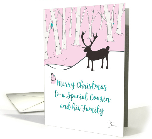 Say "Merry Christmas" to a special cousin and his family with this cheerful greeting card featuring my original whimsical illustration / artwork of a reindeer silhouette in snow against a pink and white forest; can you spot the two deer hidden in the trees? The inside verse reads, "Thinking loving thoughts of you, hoping the magic of the season will fill your hearts now and last the whole year through!"