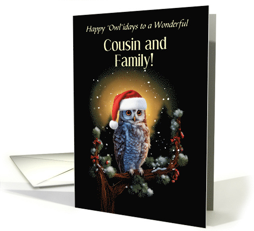 Cousin and Family Happy Holidays Cute Owl and Santa Hat Custom