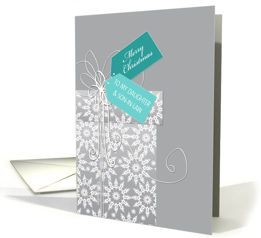 Send warm Christmas wishes to your daughter & son-in-law with this contemporary Christmas card.This elegant card features a present or gift (wrapped in grey gift wrap paper with white snowflakes) white swirly ribbon and tags. You can edit text inside card yourself