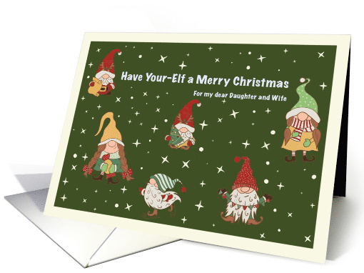 A charming Christmas card featuring six whimsical gnomes dressed in festive hats and cozy winter clothes, surrounded by stars and snow on a dark green background. The front message reads "Merry you a whimsical Christmas“ for daughter and wife