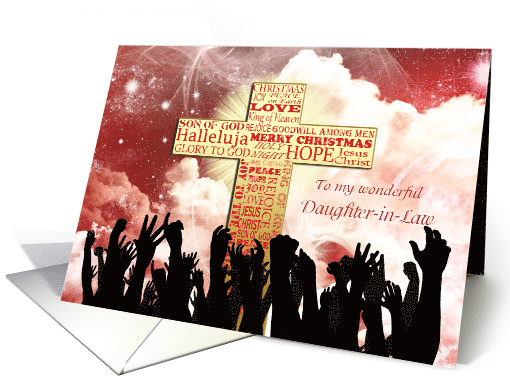 | Artist Notes: | A Christmas card for your daughter-in-law. A very different Christmas card. Cheering crowds are waving their hands in front of a golden cross. The cross is inscribed with Christmas greetings and phrases in red. In the background is a red sky with swirling crowds and stars. Send a religious message this Christmas with a card that exudes happiness. |