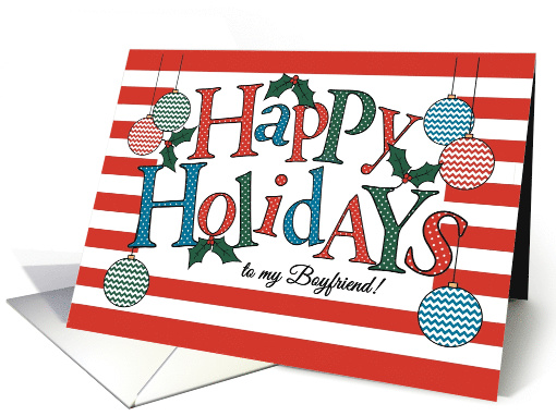 | Artist Notes: | A fun, text-based Happy Holidays card for a Boyfriend, with Baubles and Lettering, filled with red, blue and green chevrons and polka dots on a striped background, decorated with sprigs of holly. There is also a custom front card with this design in case you can't find a card for the specific recipient you're looking for. |