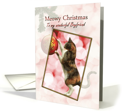 | Artist Notes: | A funny Christmas card for your boyfriend showing a calico cat standing on hind legs and playing with a red ball decoration on a Christmas tree. A fun card to send to cat loving friends or family. |
