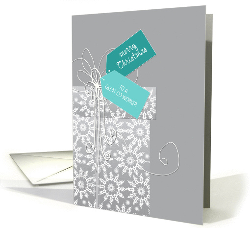 Send stylish Christmas wishes to your co-worker with this contemporary card.This elegant Christmas card features a present or gift (wrapped in grey gift wrap paper covered with white snowflakes) a white swirly ribbon and tags. You can edit text inside card yourself.