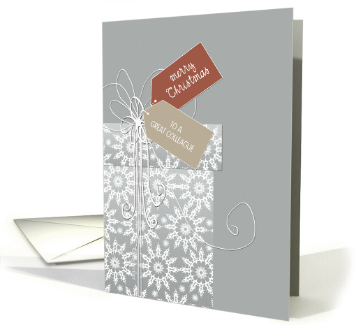 Send stylish Christmas wishes to your colleague with this contemporary card.This elegant Christmas card features a present or gift (wrapped in grey gift wrap paper covered with white snowflakes) a white swirly ribbon and tags. You can edit text inside card yourself.
