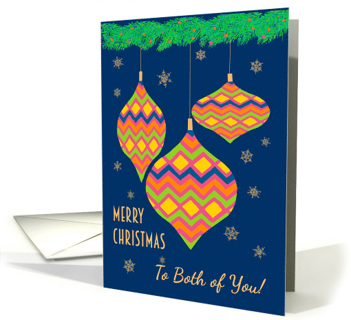 A brightly colored Christmas card to a couple or any two people, with three colourful hanging ornaments decorated with chevron patterns, suspended from a garland of fir sprigs. The front cover greeting, is, 'MERRY CHRISTMAS To Both of You!', in gold-colored lettering on a glossy dark blue background. The inside message is just a suggestion and you can easily change it or delete it altogether, if you wish.