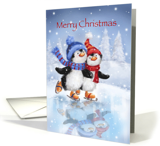 In outdoor snow scene, penguin couple ice skating together with their reflect on ice. Merry Christmas to both of you