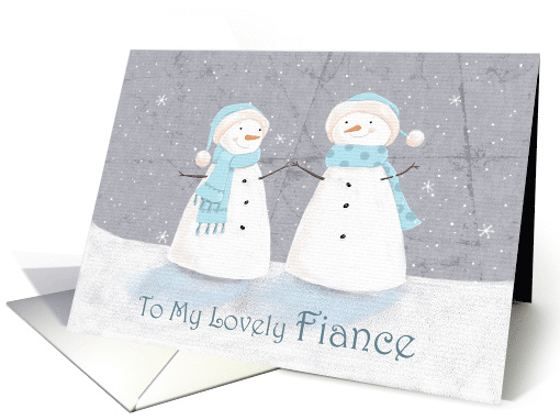 To My Lovely Fiance Christmas Holiday card. Illustrated with a cute snowman couple in a pastel art style. Background in the style of textured parchment paper. ©DaleSimpson