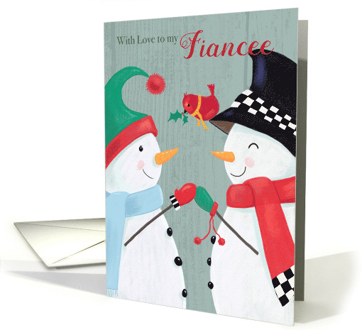 "With Love to my Fiancee" Christmas Holiday Greeting Card design illustrated with two adorable snowmen characters facing each other and a little red cardinal bird. ©DaleSimpson